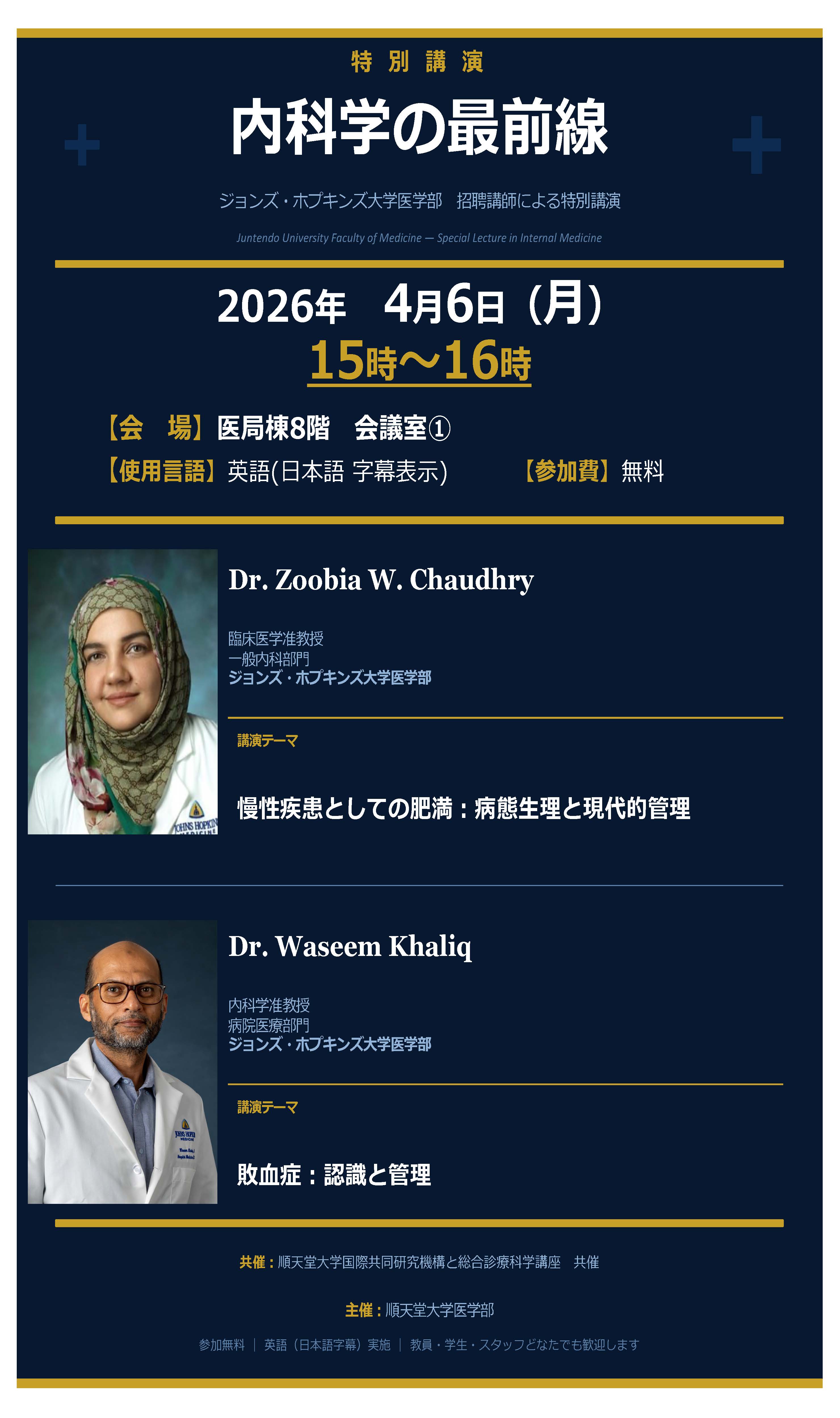 | 講演者 | 〇 Dr. Zoobia W. Chaudhry ジョンズ・ホプキンス大学医学部 臨床医学准教授 講演テーマ「慢性疾患としての肥満:病態生理と現代的管理」 〇 Dr. Waseem Khaliq ジョンズ・ホプキンス大学ベイビュー医療センター 内科学准教授 講演テーマ「Sepsis – Recognition and Management」 |